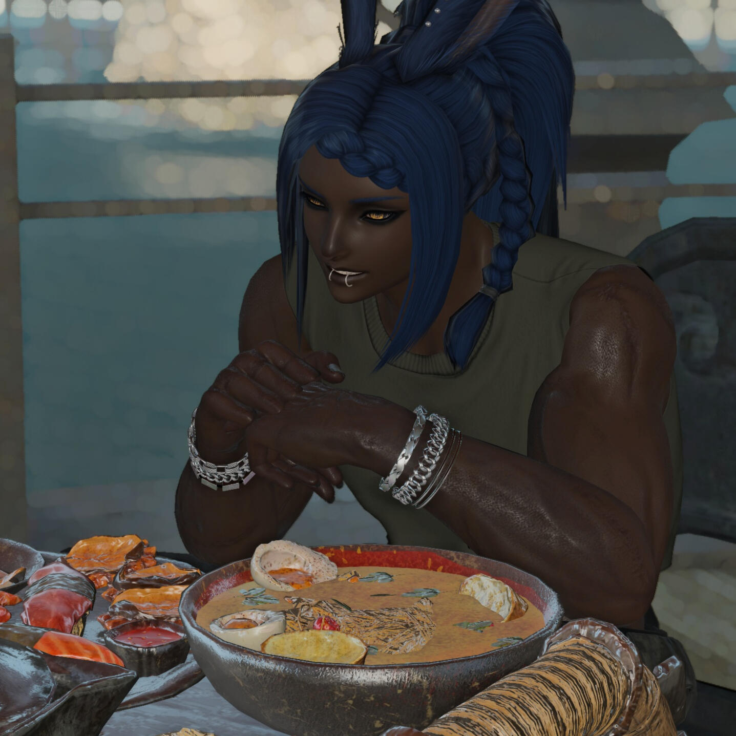 There's few things Naja loves more than trying a new food: the stranger the better. His interest in exploring extends to his palate, and he's always willing to try the local delicacy. In addition to eating, Naja also enjoys cooking, and has built up solid home cook skills. If your character frequents restaurants, sells rare ingredients, or is a cook themselves, Naja may end up interacting with them.
